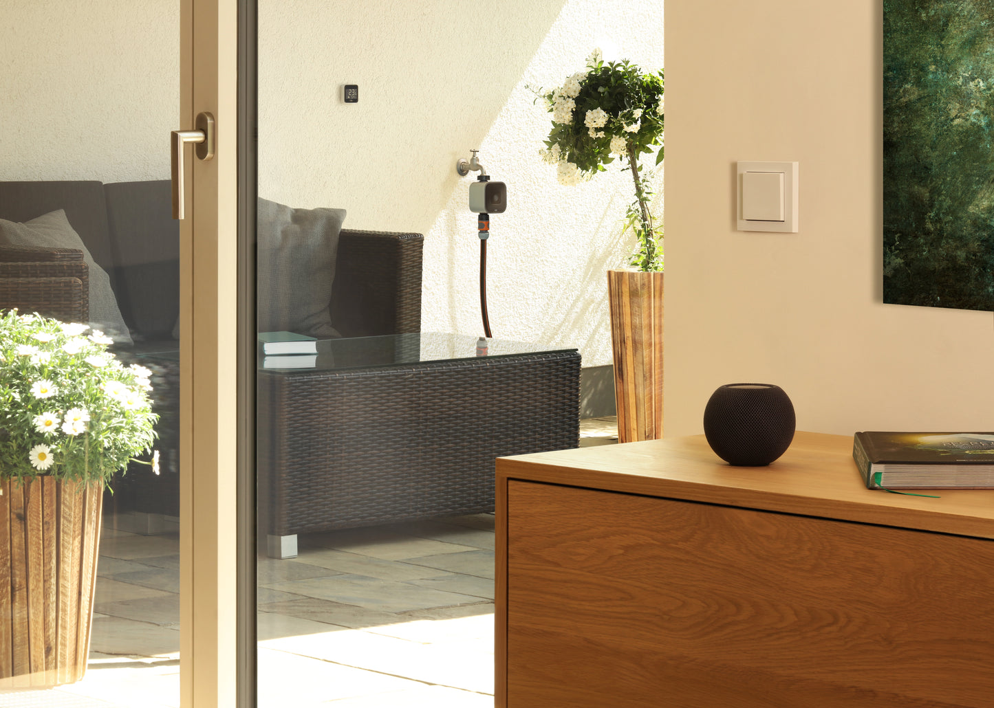 In combination with a HomePod mini or the new Apple TV, Eve Aqua also supports Thread. This technology makes your smart home faster, more reliable and increases its reach: Simply position a Full Thread Device, such as Eve Energy, as close as possible to your Eve Aqua. Eve Energy will then act as a router and relay data packets from Eve Aqua. This way, Eve Aqua is always in reach – anywhere in your garden.